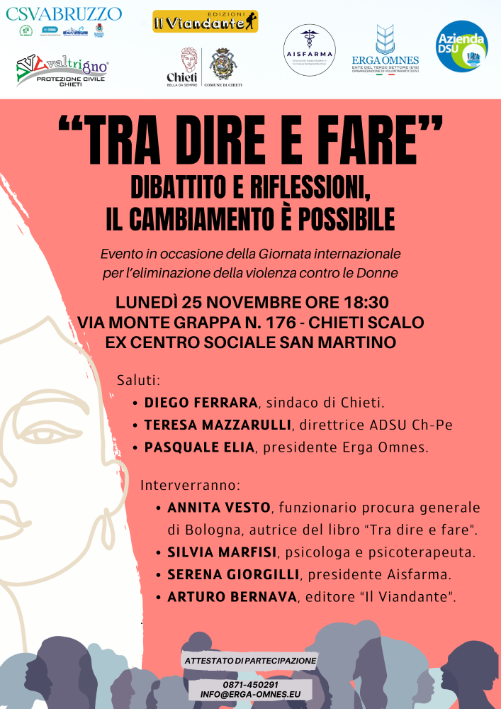 "TRA DIRE E FARE", dibattito e riflessioni, il cambiamento è possibile, è il titolo dell’evento, organizzato dall’associazione Erga Omnes, in occasione della Giornata internazionale per l'eliminazione della violenza contro le Donne.