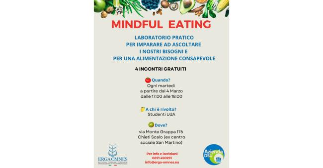 L’associazione Erga Omnes, in collaborazione con l’ADSU (Azienda per il Diritto agli Studi Universitari), presenta il laboratorio pratico “Mindful Eating”, un'opportunità gratuita rivolta agli studenti dell’Università d’Annunzio per sviluppare una relazione sana e consapevole con il cibo. Il laboratorio, condotto dalla psicoterapeuta Dott.ssa Zaira Lazzari, si terrà in 4 incontri, ogni martedì a partire dal 4 marzo, dalle 17:00 alle 18:00, presso la sede operativa di Erga Omnes, in via Monte Grappa n. 176, Chieti Scalo (ex centro sociale San Martino).