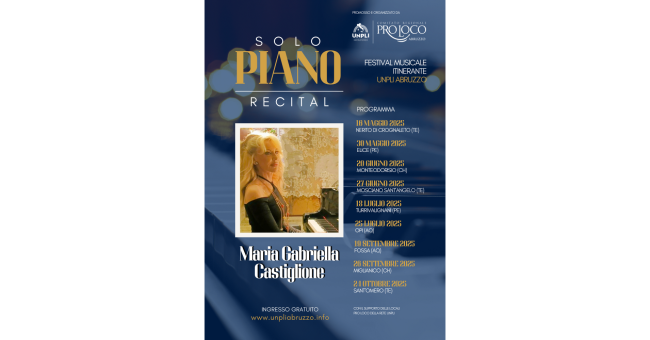 Una rassegna di concerti a ingresso gratuito, in location di indubbio fascino, nelle quattro province abruzzesi con un’artista di spessore, la pianista Maria Gabriella Castiglione: sono questi gli elementi caratterizzanti di Solo Piano Recital, il primo festival musicale itinerante promosso dall’UNPLI-Unione nazionale delle Pro Loco Italiane Abruzzo, principale organizzazione di rappresentanza delle Pro Loco abruzzesi, che ha preso il via venerdì 16 maggio a Nerito di Crognaleto e si concluderà il 24 ottobre prossimo a Sant’Omero.