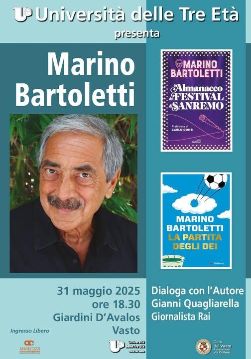 A chiusura dell'anno accademico 2024/2025, l'Università delle Tre Età di Vasto organizza ai Giardini di Palazzo d'Avalos un incontro con Marino Bartoletti.
