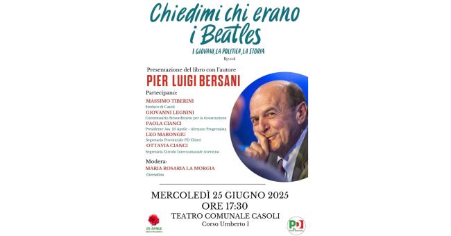 Mercoledì 25 giugno alle ore 17.30 il Teatro Comunale di Casoli ospiterà un appuntamento di rilievo: la presentazione del nuovo libro dell’On. Pierluigi Bersani, "Chiedimi chi erano i Beatles – I Giovani, la Politica, la Storia".
