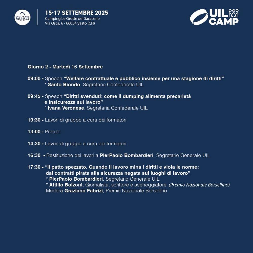 Martedì 16 settembre, inizierà con due speech: “Welfare contrattuale e pubblico insieme per una stagione di diritti”, a cura del segretario confederale Uil Santo Biondo; “Diritti svenduti: come il dumping alimenta precarietà e insicurezza sul lavoro” con la segretaria confederale Uil Ivana Veronese. Nel pomeriggio ci sarà l’intervento del segretario generale Uil PierPaolo Bombardieri che si confronterà con i giovani sindacalisti su tematiche di stretta attualità legate al mondo del lavoro e parteciperà alla tavola rotonda, moderata da Graziano Fabrizi, “Il patto spezzato. Quando il lavoro mina i diritti e viola le norme: dai contratti pirata alla sicurezza negata sui luoghi di lavoro” con la straordinaria partecipazione di Attilio Bolzoni, giornalista del quotidiano Domani, per molti anni inviato di Repubblica e ideatore del Blog Mafie.