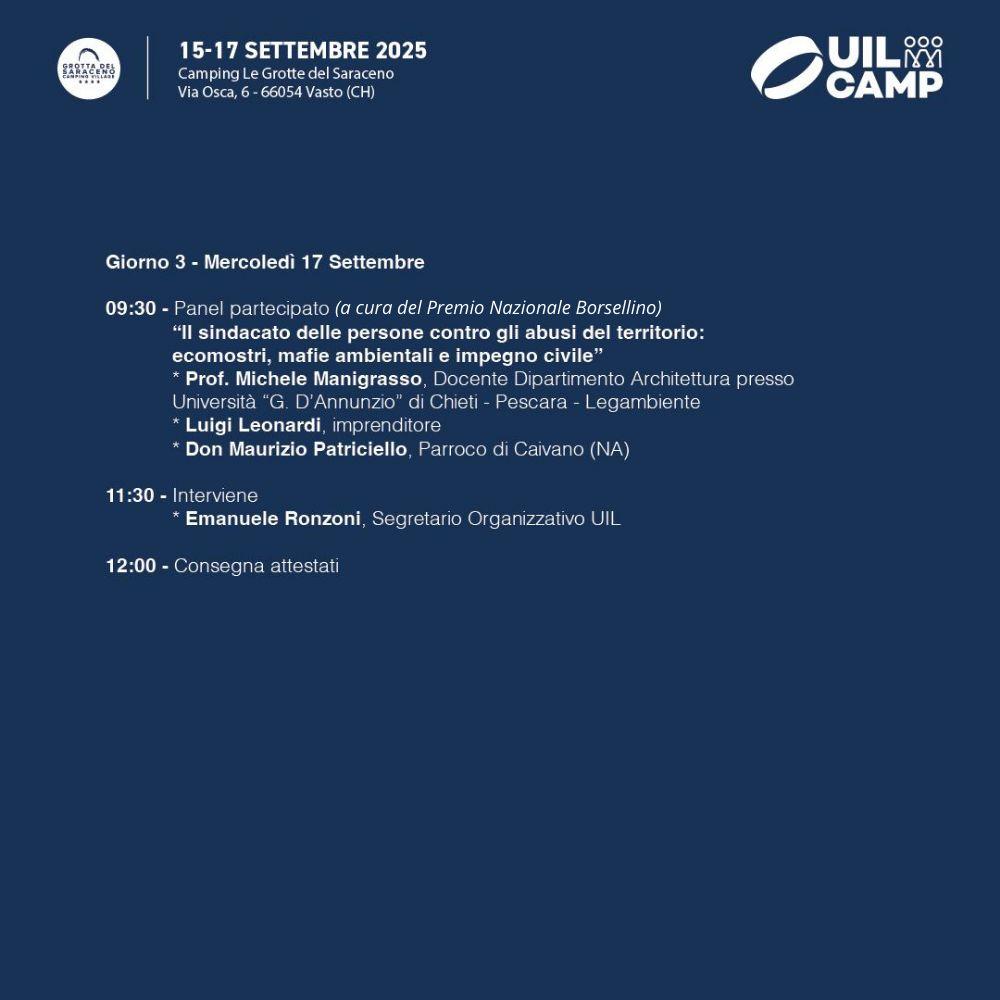 La giornata conclusiva, mercoledì 17 settembre, sarà dedicata al tema della legalità con il panel a cura del Premio nazionale Paolo Borsellino “Il sindacato delle persone contro gli abusi del territorio: ecomostri, mafie ambientali e impegno civile”. Al dibattito parteciperanno il prof. Michele Manigrasso dell’Università “G. D’Annunzio” Chieti Pescara, l’imprenditore campano anticamorra Luigi Leonardi e Don Maurizio Patriciello, parroco di Caivano (Na), nel cuore della Terra dei Fuochi, impegnato in prima linea nella lotta alla criminalità organizzata. In chiusura l’intervento del segretario organizzativo Uil Emanuele Ronzoni.