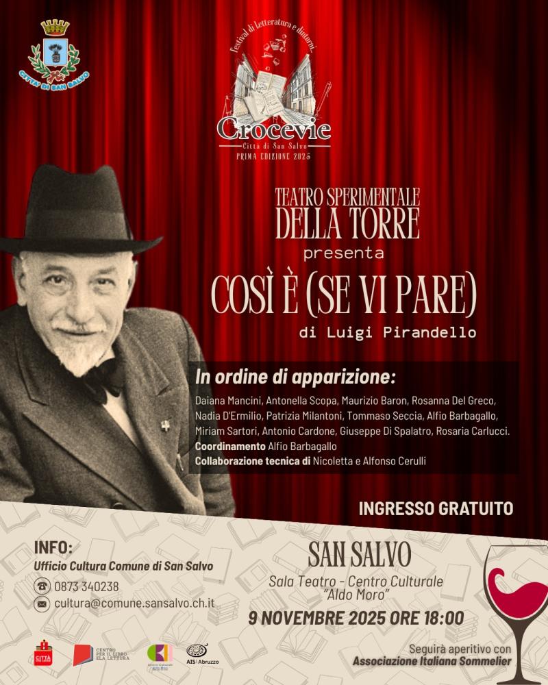 Lo spettacolo andrà in scena domenica 9 novembre alle ore 18 presso Sala Teatro del Centro Culturale ‘’Aldo Moro” a San Salvo all’interno del Festival di Letteratura e dintorni – Crocevie prima edizione 2025