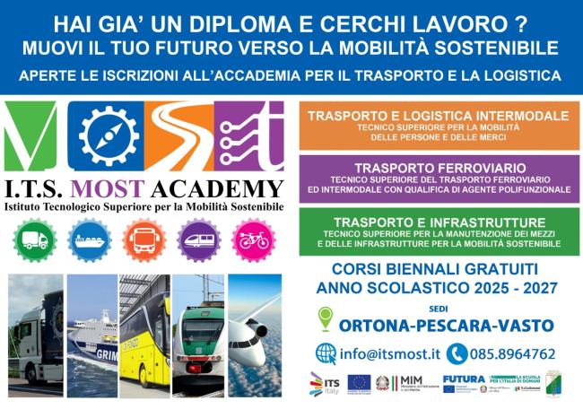 L’ITS Academy di Ortona è uno dei sei ITS presenti in Abruzzo che presenta un’offerta di Alta formazione che permette di entrare nell’immediato nel mondo del lavoro. Il Most di Ortona organizza e gestisce corsi di alta formazione nel campo della mobilità sostenibile di trasporto di persone e merci ed è, in questo senso, un punto riferimento importante per quei giovani che voglio intraprendere la carriera lavorativa nel campo della logistica soprattutto nel trasporto ferroviario, nella mobilità urbana e extraurbana oppure nel campo dei servizi alle imprese, come la manutenzione dei mezzi di trasporto.