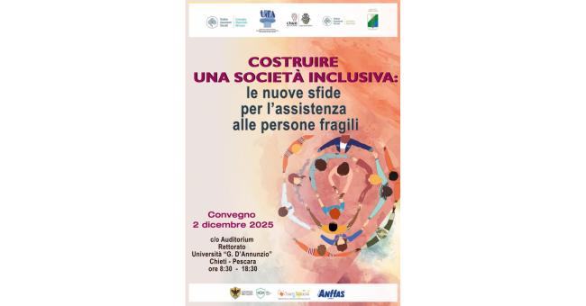 Appuntamento martedì 2 dicembre al Rettorato dell'Università d'Annunzio a Chieti con il convegno “Costruire una società inclusiva: le nuove sfide per l’assistenza alle persone fragili”, una giornata di approfondimento dedicata a un tema fondamentale per il futuro del welfare: la costruzione di una società realmente inclusiva, capace di rispondere ai bisogni delle persone più vulnerabili.