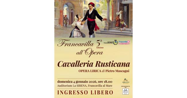 Il Comune di Francavilla al Mare , in collaborazione con la BJManagement, presenta la quinta edizione di "Francavilla all’Opera" con un appuntamento storico e per la prima volta invernale: domenica 4 gennaio alle ore 18, l’Auditorium Sirena ospiterà per la prima volta la Cavalleria Rusticana di Pietro Mascagni, in forma di concerto con solisti, coro e pianoforte.