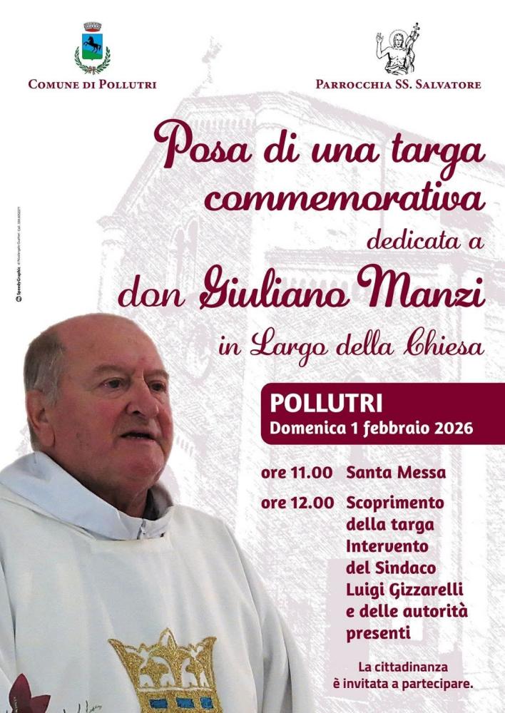 Domenica 1 febbraio, a un anno dalla scomparsa di Don Giuliano Manzi, indimenticato parroco a Pollutri (dal 1969 al 2018), sarà ricordato “un uomo che ha rappresentato una guida di fede, umiltà e amore per la nostra comunità”, si evidenzia in una nota del Comune di Pollutri.