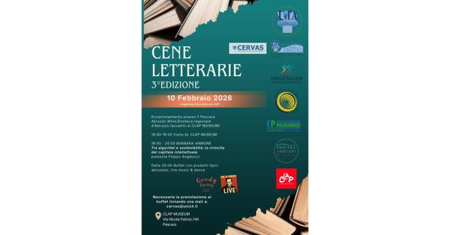 L’Università “Gabriele d’Annunzio” di Chieti-Pescara promuove un nuovo incontro della III edizione delle Cene Letterarie, progetto dal titolo: “La Metamorfosi del Mondo”, edizione diretta da Andrea Pitasi e Tiziana Pietrangelo, docenti della d’Annunzio. Il prossimo appuntamento sarà martedì 10 febbraio 2026, a partire dalle ore 18.30.
