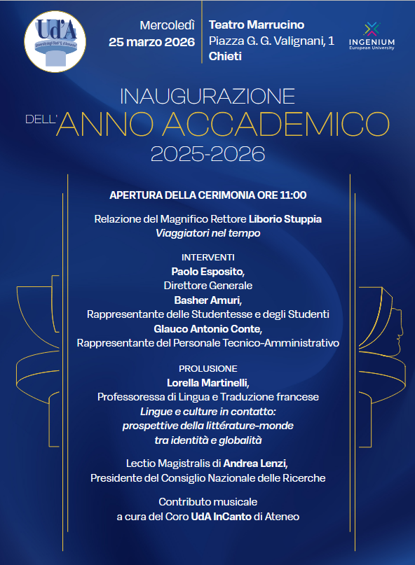 La Cerimonia di Inaugurazione dell'Anno Accademico 2025/2026 dell'Università degli Studi ‘Gabriele d’Annunzio' di Chieti-Pescara si terrà mercoledì 25 marzo, alle ore 11.00 presso il Teatro Marrucino di Chieti.