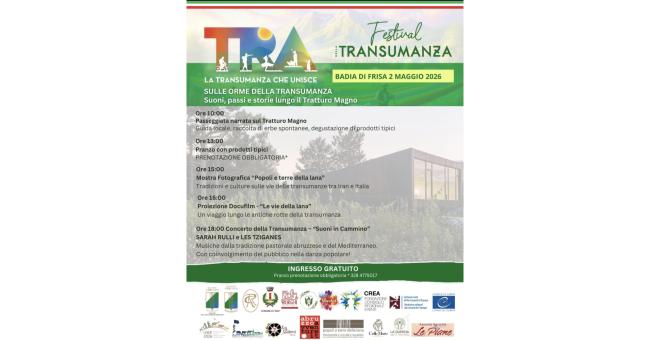 Il Comune di Frisa ospiterà il “Festival Sulle Orme della Transumanza – Suoni, Passi e Storie lungo il Tratturo Magno”, in programma sabato 2 maggio lungo lo storico Tratturo Magno, in località Badia di Frisa.