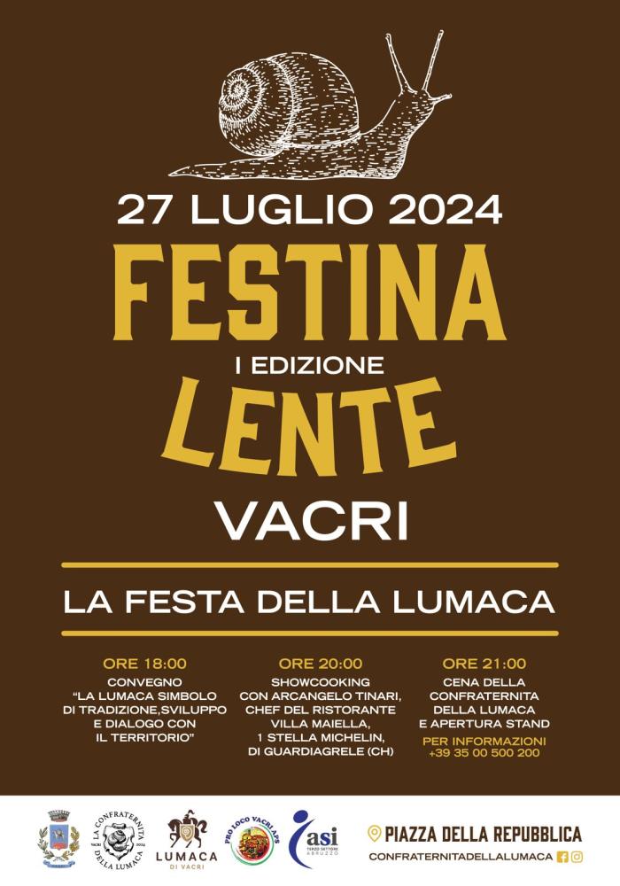 “La lumaca simbolo di tradizione, sviluppo e dialogo con il territorio”. È questo il titolo del convegno che si terrà il prossimo 27 luglio alle 18,00 in Piazza della Repubblica a Vacri all’interno di “Festina Lente”, la prima festa dedicata alla lumaca.