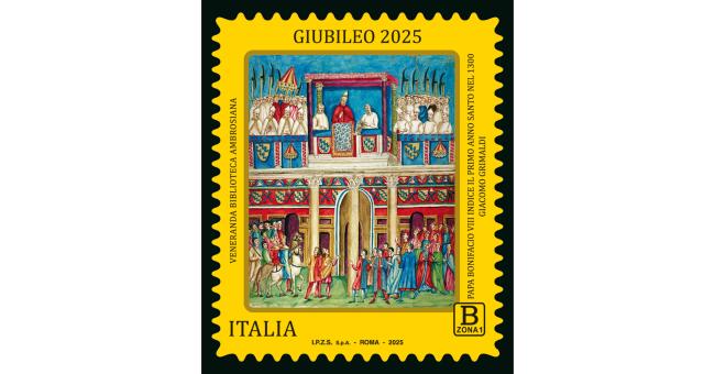 Completano il francobollo le legende “GIUBILEO 2025”,” “PAPA BONIFACIO VIII INDICE IL PRIMO ANNO SANTO”, “GIACOMO GRIMALDI” e “VENERANDA BIBLIOTECA AMBROSIANA”, la scritta “ITALIA” e l’indicazione tariffaria “B zona 1”.