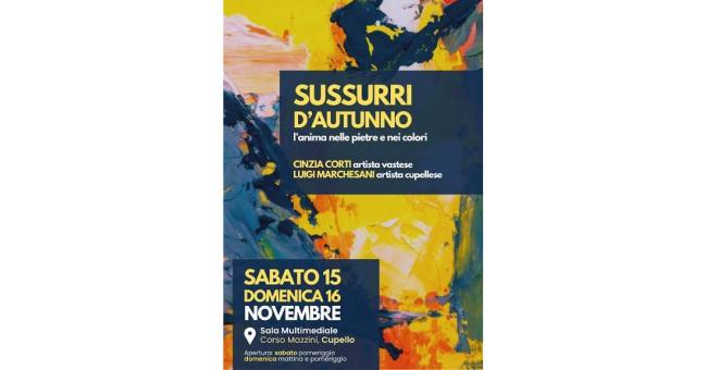Nel suggestivo scenario della Sala Multimediale del Comune di Cupello, presso Corso Mazzini, sabato 15 e domenica 16 novembre si terrà la mostra d’arte “Sussurri d’Autunno – L’anima nelle pietre e nei colori”, un incontro tra materia e sentimento che unisce due sensibilità artistiche del territorio: Cinzia Corti, artista vastese, e Luigi Marchesani, artista cupellese.