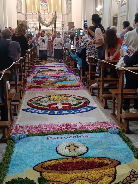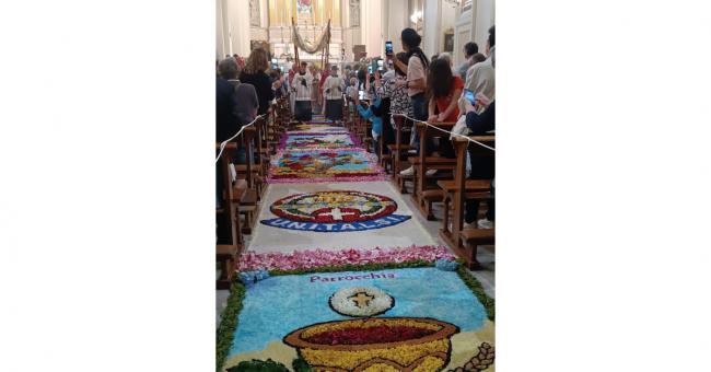 Nella Chiesa di Santa Maria Maggiore il tappeto di petali di fiori resterà anche oggi e farà da cornice alle celebrazioni delle messe del Corpus Domini.