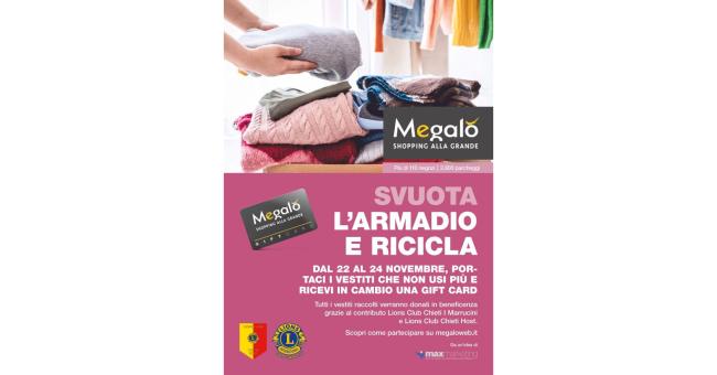 Dal 22 al 24 novembre il Lions Club Chieti I Marrucini e il Lions Club Chieti Host, in collaborazione con il Centro Commerciale Megalò, organizzano l’evento “Svuota l’armadio e ricicla”, una raccolta di abiti usati da destinare ai più bisognosi.