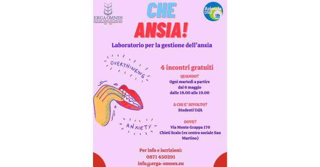 Prende il via il laboratorio “Che ansia!”, un percorso di quattro incontri gratuiti dedicato alla gestione dell’ansia rivolto agli studenti dell’Università degli Studi “G. d’Annunzio”. L’iniziativa è promossa dall’Associazione Erga Omnes in collaborazione con ADSU Chieti-Pescara, con l’obiettivo di offrire strumenti pratici per affrontare uno dei disagi più comuni tra i giovani universitari.