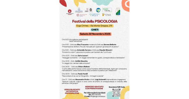 L’Associazione Erga Omnes e AltraPsicologia, con il patrocinio dell’Ordine delle Psicologhe e degli Psicologi d’Abruzzo, della Regione Abruzzo, del Comune di Chieti, dell’Azienda per il Diritto agli Studi Universitari (ADSU) Chieti-Pescara, del CSV Abruzzo e della Provincia di Chieti, organizzano il Festival della Psicologia di Chieti 2025, una giornata interamente dedicata alla promozione del benessere psicologico, alla consapevolezza e alla crescita personale.