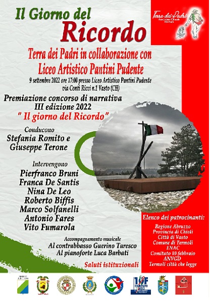 Il ricordo delle vittime delle foibe ha il suo culmine nella giornata del 10 febbraio ma, in realtà, eventi ed iniziative vengono organizzate lungo tutto l’anno. E le scuole, così come previsto nella legge istitutiva, sono protagoniste e al centro. Sarà proprio una scuola, il Liceo Artistico Pantini-Pudente, ad ospitare la cerimonia di premiazione della III edizione del concorso “Il giorno del ricordo”, organizzato dall’associazione “Terra dei Padri”. Appuntamento il 9 settembre alle ore 17 presso l’Istituto. «La Giuria di qualità, composta dal Presidente Pierfranco Bruni(Presidente Centro Studi Francesco Grisi), Stefania Romito (scrittrice e giornalista), Nina De Leo (poetessa e scrittrice), Vito Fumarola (docente), Roberto Biffis(ANVGD Treviso), Marco Solfanelli(editore) e Franca De Santis (Presidente Terra dei Padri), ha riconosciuto a tutti i partecipanti delle tre sezioni (Giovani, Racconto, Poesia) una grande abilità interpretativa nell’aver saputo penetrare il tema coniugando la testimonianza storica a una profonda indagine ontologica – rendono noto gli organizzatori - durante l’evento si terrà la suggestiva Mostra d’arte a tema per suggellare la prodigiosa potenza evocativa dovuta alla simbiotica fusione tra parola scritta e arte figurativa».