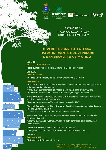 INTERVENTI: Rebecca Virtù, Presidente del Circolo Legambiente Geo APS; Aldo Giorgio Pezzi, Funzionario Architetto - Soprintendenza archeologica belle arti e paesaggio dell'Abruzzo “Il viale della Rimembranza ad Atessa a cento anni dalla piantumazione: l’importanza del ricordo dei caduti e del valore paesaggistico del sito”; Massimo Angrilli, Professore Ordinario di Urbanistica – Facoltà di Architettura – Università degli Studi D’Annunzio “Sviluppo urbano sostenibile e infrastrutture verdi e blu”; Pierluigi Raschiatore e Mario Romano, Carabinieri forestali per la Biodiversità Reparto Castel Di Sangro “Competenze e aree di intervento dei carabinieri forestali”; Paride Pacifico, Consigliere regionale dell’Ordine Agronomi Forestali della Provincia di Chieti “Spazi verdi e salute pubblica: il ruolo del dott. agronomo nella gestione del verde urbano”; Fabrizio Di Marco, Direttore BCC Abruzzo e Molise “Il progetto di bosco diffuso promosso dalla BCC Abruzzo e Molise”; Ore 12.00 CONCLUSIONI Giulio Borrelli, Sindaco di Atessa.