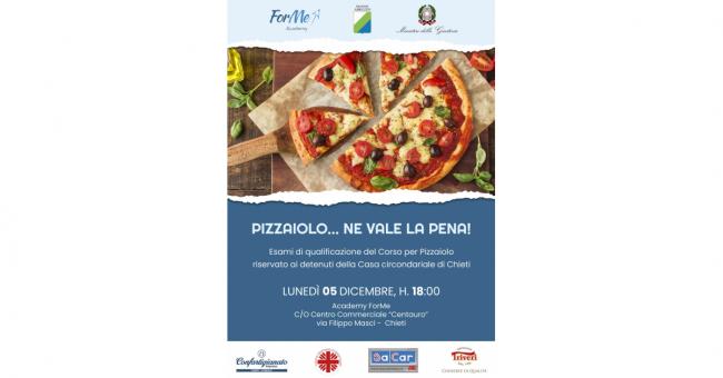 Lunedì 5 dicembre, alle ore 18:00, nella sede di Academy ForMe, al primo piano del Centro commerciale “Centauro”, in via Filippo Masci, a Chieti, si terrà l’esame finale che consentirà ai detenuti di ottenere la qualificazione professionale di pizzaiolo valida ai sensi del D.Lgs 13/13. All’iniziativa saranno presenti le istituzioni di riferimento e le autorità civili, militari e religiose.