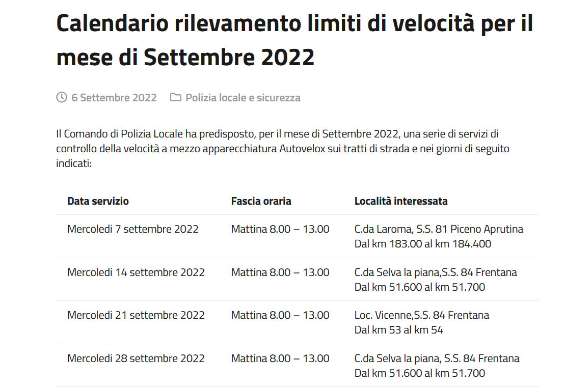 Il comune di Casoli ha pubblicato il calendario dei controlli della velocità , predisposti dalla polizia locale, per il mese di Settembre nel territorio comunale
