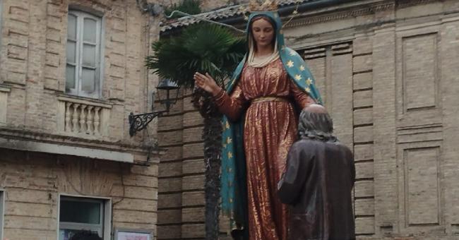 La tradizione narra che Alessandro Muzio, l’11 giugno 1576, si recò ai suoi campi con la paura dei danni che poteva aver comportato la terribile tempesta che si era abbattuta sul circondario. Durante il cammino gli apparve Maria Santissima e lo rassicurò: per la sua grande devozione i suoi campi erano rimasti intatti. Sul cammino di Alessandro Muzio anche ieri sera è tornata la tradizionale processione dal centro di Casalbordino alla Basilica Madonna dei Miracoli. Così come accaduto l’anno scorso il meteo ha fatto temere più di qualcuno. Mentre la processione iniziava il cammino alcuni forti tuoni si sono sentiti in lontananza. Ma così come la forte devozione di Alessandro Muzio preservò i suoi campi ieri sera il cielo si è trattenuto fin quasi all’arrivo sul sagrato. Alcune gocce di pioggia sono cominciate a scendere mentre si stavano percorrendo gli ultimi chilometri. Mentre la testa del corteo percorreva gli ultimi passi la pioggia è giunta. Ma il momento più forte del rovescio è arrivato dopo che la statua della Madonna, coperta per preservarla dal comitato feste all’arrivo delle prime gocce di pioggia, e i pellegrini erano entrati nella Basilica per la Santa Messa conclusiva. L’amore e la devozione per Maria Santissima dei Miracoli, patrona della Diocesi di Chieti-Vasto, non si sono lasciati spaventare dal meteo e non sono stati minimamente frenati dall’arrivo della pioggia.
