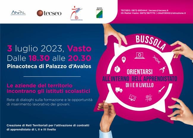 L’evento Orientarsi all’interno del mondo dell’apprendistato è organizzato dall’ATS Bussola, nata dall’incontro tra la Tecseo srl, società di formazione situata a Mozzagrogna che da 23 anni analizza il fabbisogno formativo di aziende e lavoratori e si opera nel creare opportunità , e l’Istituto ‘Mattei’ di Vasto, scuola conosciuta per il suo animo innovativo e fortemente interessata a dare un futuro concreto ai propri giovani.