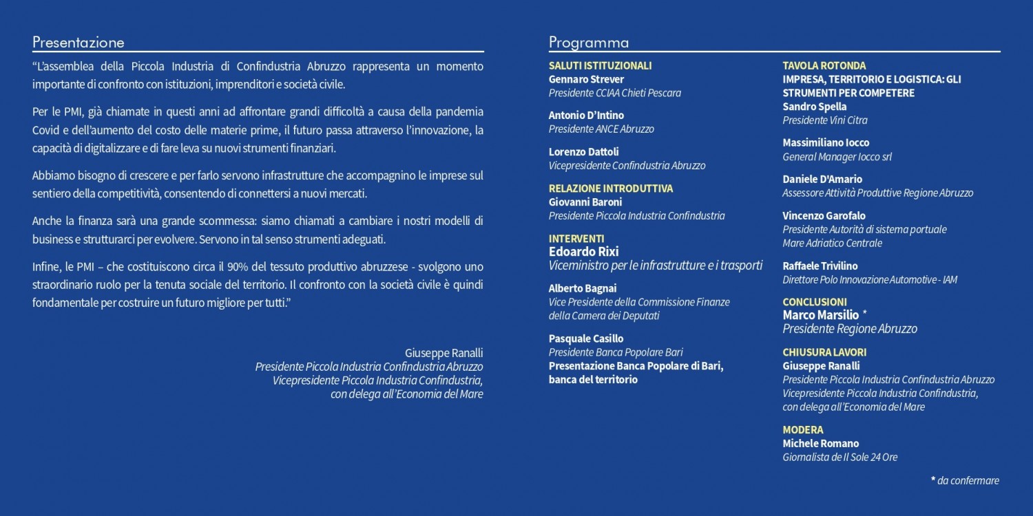 “L’assemblea della Piccola Industria di Confindustria Abruzzo rappresenta un momento importante di confronto con istituzioni, imprenditori e società civile.”, spiega Ranalli, che è anche Vice Presidente Piccola Industria Confindustria con delega all’Economia del Mare. “Per le PMI, già chiamate in questi anni ad affrontare grandi difficoltà a causa della pandemia Covid e dell’aumento del costo delle materie prime, il futuro passa attraverso l’innovazione, la capacità di digitalizzare e di fare leva su nuovi strumenti finanziari. Abbiamo bisogno di crescere e per farlo servono infrastrutture che accompagnino le imprese sul sentiero della competitività, consentendo di connettersi a nuovi mercati. Le PMI – che costituiscono circa il 90% del tessuto produttivo abruzzese - svolgono uno straordinario ruolo per la tenuta sociale del territorio. Il confronto con la società civile è quindi fondamentale per costruire un futuro migliore per tutti."