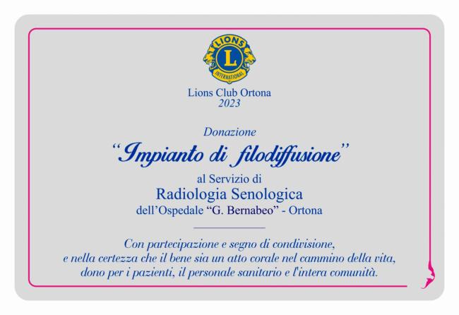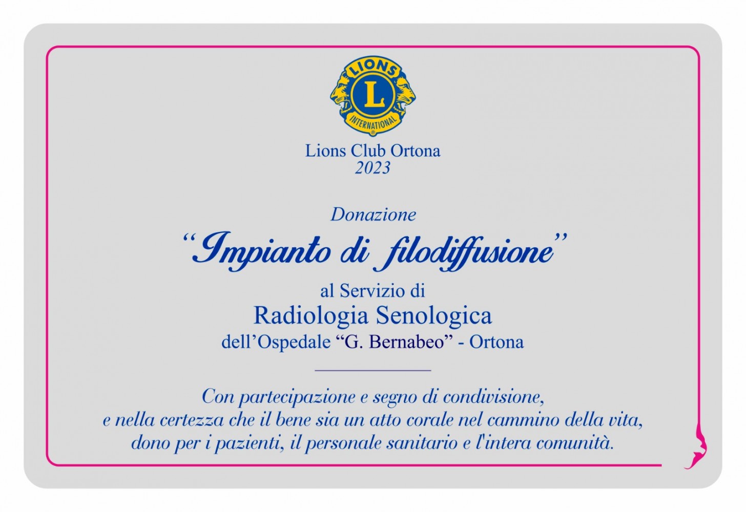 Da qualche giorno è attivo l'impianto di filodiffusione donato dal Lions Club e acquistato con i fondi ricavati dal recital del soprano Carmela Remigio, promosso tempo addietro con la dichiarata finalità di contribuire a rendere più lieve l'attesa delle donne che devono sottoporsi a indagini diagnostiche.