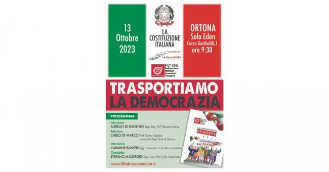La FILT Abruzzo Molise, la categoria sindacale delle lavoratrici e dei lavoratori dei trasporti della CGIIL, organizza per il giorno 13 ottobre alle ore 10 ad Ortona (Sala Eden) un convegno sulla Costituzione Italiana dal titolo “Trasportiamo la Democrazia”.