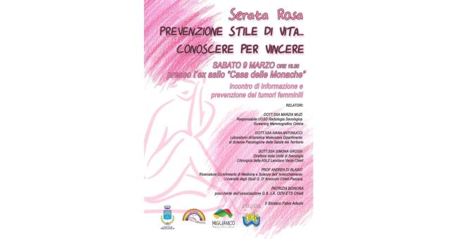 Da qualche anno, l’amministrazione comunale di Miglianico dedica alla Giornata Internazionale della Donna una «Serata Rosa» che si declina diversamente di edizione in edizione: quest’anno (la scelta è caduta sulla prevenzione) si arricchisce con un pomeriggio dedicato alla prevenzione, fissato al 9 marzo alle 16.00 presso la ex Casa delle Monache «Sant’Anna» in via Sud, in cui esperti e medici si confronteranno su un tema particolarmente sensibile per la salute delle donne, il ruolo della prevenzione nella trattazione dei tumori femminili.