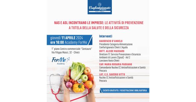 Queste le finalità dell’evento gratuito dal titolo “Nas e Asl incontrano le imprese: le attività di prevenzione a tutela della salute e della sicurezza”. L’appuntamento è per giovedì 11 aprile, alle ore 16:00, nella sede di Academy ForMe, al primo piano del centro commerciale Centauro, in via Filippo Masci, a Chieti. L’iniziativa è promossa da Confartigianato Imprese Chieti L’Aquila.