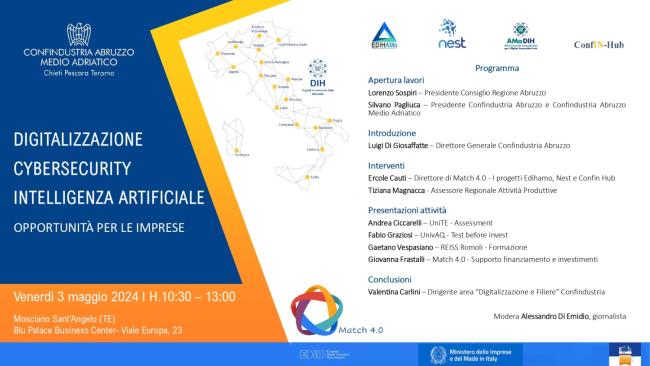 Nata nel 2018 da tutte le associazioni Confindustriali abruzzesi, MATCH 4.0 – Digital Innovation Hub Abruzzo è una struttura agile e diffusa sul territorio che ha l’obiettivo di facilitare e promuovere attraverso attività di sensibilizzazione, formazione e affiancamento, processi di trasformazione digitale, di innovazione e sostenibilità nei settori dell’Intelligenza Artificiale e dell’High Performance Computing.