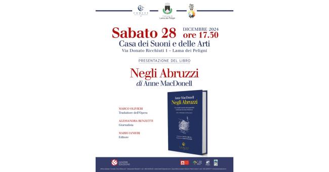 Sabato 28 dicembre alle ore 17.30 presso la Casa dei Suoni e delle Arti di Lama dei Peligni, ci sarà la presentazione del nuovo volume della collana blu dedicata alla narrativa di viaggio per "Comete. Scie d'Abruzzo" della Ianieri Edizioni: si tratta di "Negli Abruzzi" di Anne MacDonell, ed il volume è stato curato dal Professor Marco Olivieri, con prefazione di Maura Chiulli.
