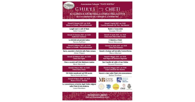 Dopo il ciclo di conferenze dedicato ai personaggi illustri della città di Chieti e quello dedicato alle donne celebri nella storia dell’Abruzzo, l’attenzione ora sarà rivolta alla componente religiosa del variegato mondo storico-religioso e culturale teatino.