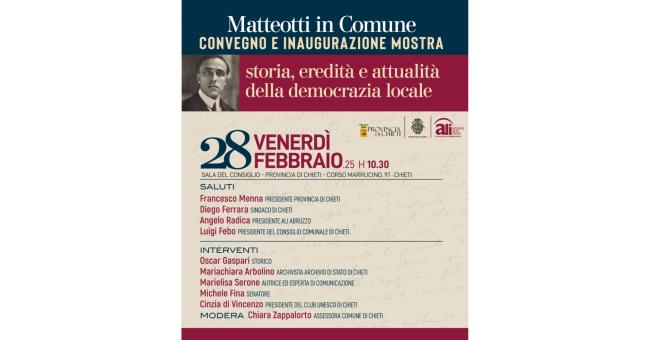 La mostra “Matteotti in Comune. Storia, eredità e attualità della democrazia locale”, che potrà essere visitata fino al 15 marzo presso il Palazzo della Provincia nella città teatina, è stata già allestita a Roma, in diversi comuni del Nord Italia e a Firenze, presso la sede della Regione Toscana, e attraverso materiale d’epoca racconta la carriera politica di Matteotti, rapito e ucciso da una squadra fascista nel 1924.