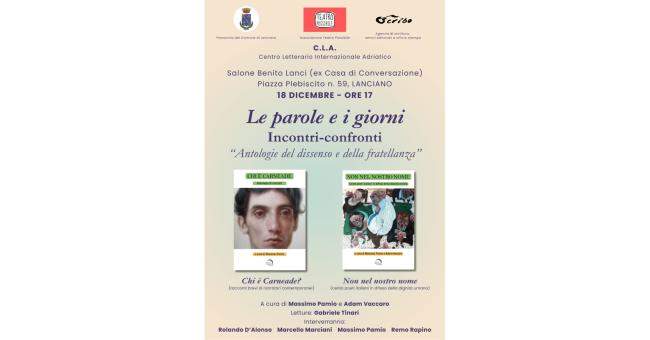Giovedì 18 dicembre alle ore 17, presso il Salone Benito Lanci (ex casa di conversazione) in Piazza Plebiscito a Lanciano, si terrà un incontro sul tema “Le parole e i giorni. Antologie del dissenso e della fratellanza”, con il patrocinio del Comune, dell’Associazione Teatro Possibile, dell’Agenzia di scrittura “Scribo”, del C.I.A., Centro Letterario Internazionale Artistico.