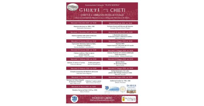 La collaborazione tra il Dipartimento di Lettere, Arti e Scienze Sociali, la Scuola di Studi Umanistici dell'Università ‘d’Annunzio' e l’Associazione culturale Teate Nostra prosegue anche per l’anno accademico 2025/2026.