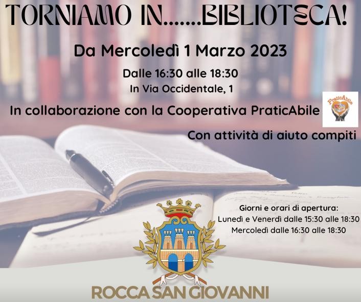 “Torniano in… Biblioteca!" È questo l’invito che l’Amministrazione comunale di Rocca San Giovanni è lieta di rivolgere a tutti gli studenti in occasione della riapertura dei locali culturali a partire dalla giornata di mercoledì 1° marzo 2023, dalle ore 16:30.