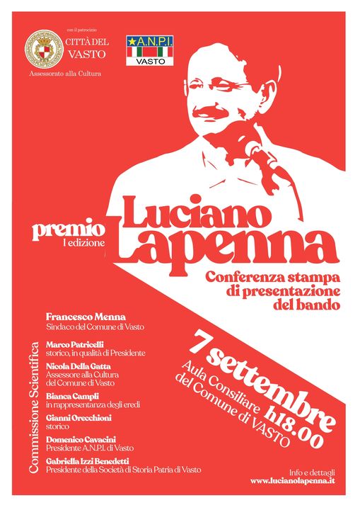 L’assessorato alla Cultura del Comune di Vasto e la locale sezione dell’Anpi (Associazione Nazionale Partigiani d’Italia) sono i promotori dell'istituzione del Premio Luciano Lapenna, dedicato alla memoria dell'esponente politico venuto a mancare un anno fa all'età di 68 anni.