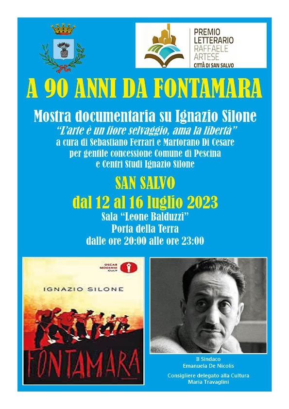 Dal 12 al 16 luglio la Sala “Leone Balduzzi” della Porta della Terra a San Salvo ospiterà la mostra documentaria su Ignazio Silone a novant’anni dalla uscita del libro “Fontamara” dal titolo “L’arte è un fiore selvaggio, ama la libertà”.