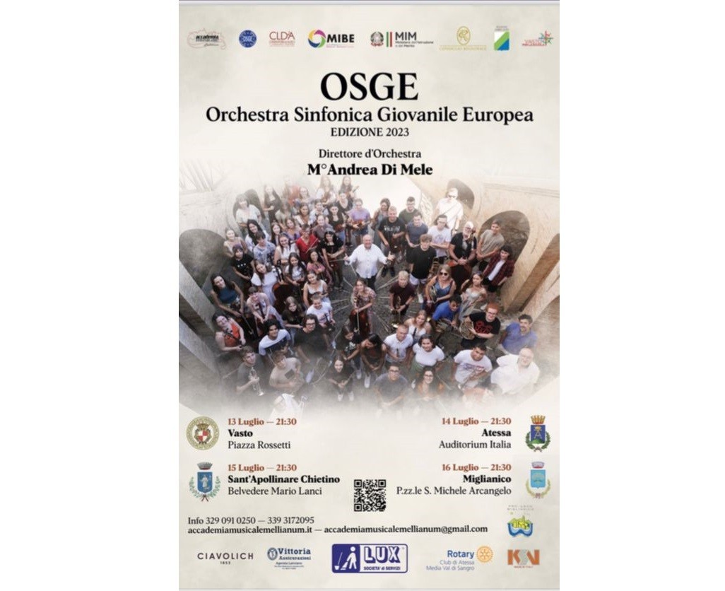 Giovedì 13 luglio alle ore 21:30 si esibirà a piazza Rossetti l’Orchestra sinfonica giovanile europea guidata dal direttore d’orchestra Prof. Andrea Di Mele. L’evento patrocinato dal Comune di Vasto e dall’Assessorato alle politiche europee ed alla Scuola prevede l’esibizione di 80 ragazzi, provenienti dalle scuole musicali gemellate con l’Accademia: da Szentendre (Ungheria), Rybnik (Polonia) Repubblica Ceca, uniti nell’universalità delle note sotto la guida attenta del direttore d’orchestra Andrea Di Mele che torna ad esibirsi a Vasto.