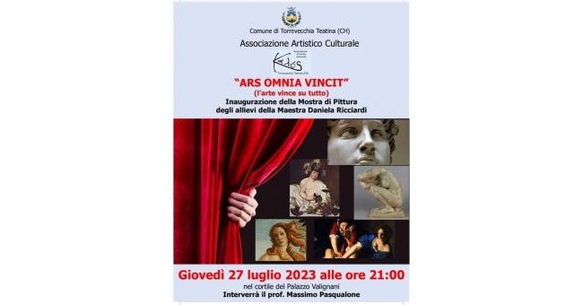 La kermesse del Festival della lettera d’Amore quest’anno si apre giovedì 27 luglio a Palazzo Valignani alle ore 21 con il vernissage della mostra "Ars omnia vincit", a cura dell'associazione Kalòs, della maestra Daniela Ricciardi, omaggio ai grandi pittori del Rinascimento e del Barocco. Interverrà Massimo Pasqualone. Brindisi inaugurale. La mostra rimarrà fino al 12 agosto, aperta dalle ore 19 alle ore 22.