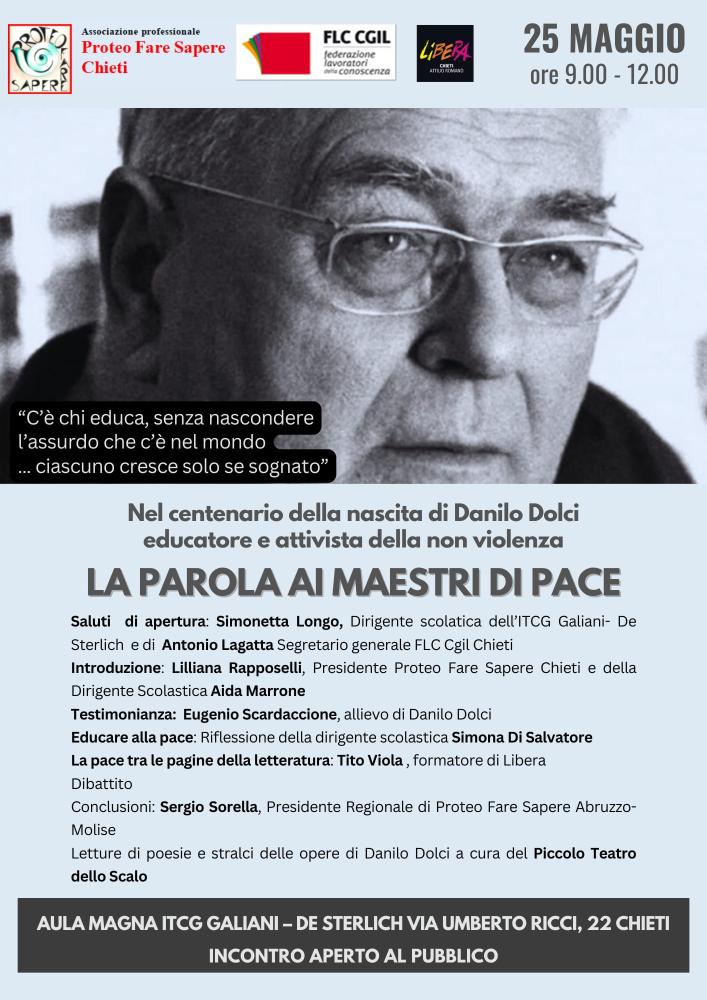 Sabato 25 maggio, dalle 9:00 alle 12:00, presso l'Aula Magna dell’ITCG Galiani – De Sterlich di Chieti, l'associazione professionale Proteo Fare Sapere Chieti, accreditata dal Miur, in collaborazione con Flc Cgil Scuola Chieti, organizza l'incontro di formazione sul tema “La parola ai maestri di pace”.