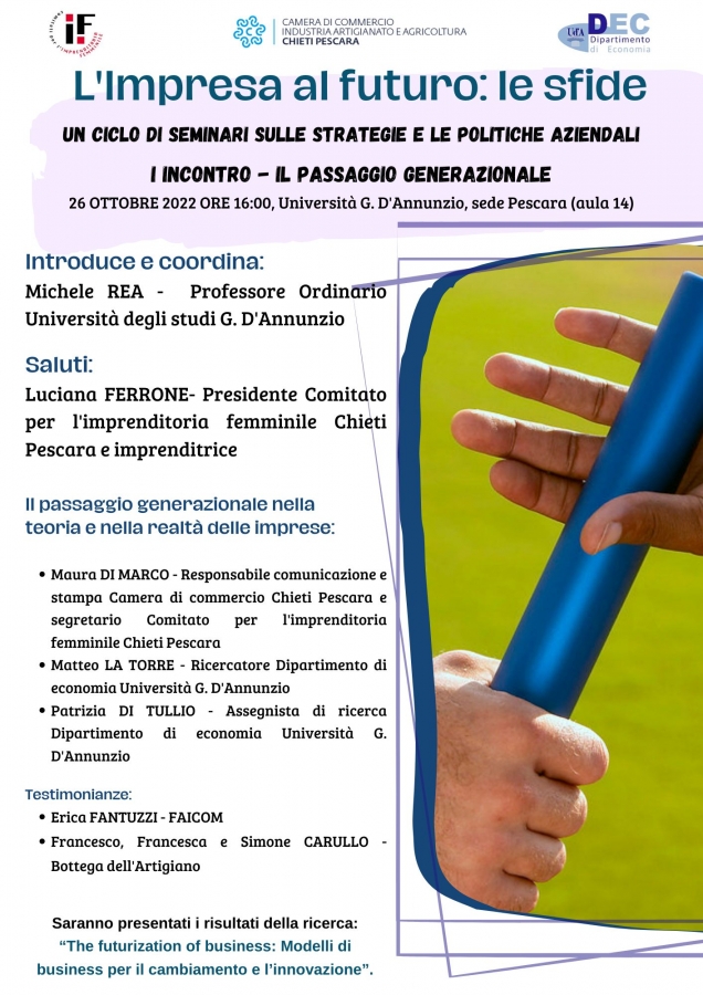 Mercoledì 26 ottobre presso la sede di Pescara dell'Università degli Studi ‘Gabriele d’Annunzio', aula 14 dell'ateneo, si svolgerà il primo dei quattro incontri promossi dal Comitato per l’imprenditoria femminile della Camera di Commercio di Chieti-Pescara.