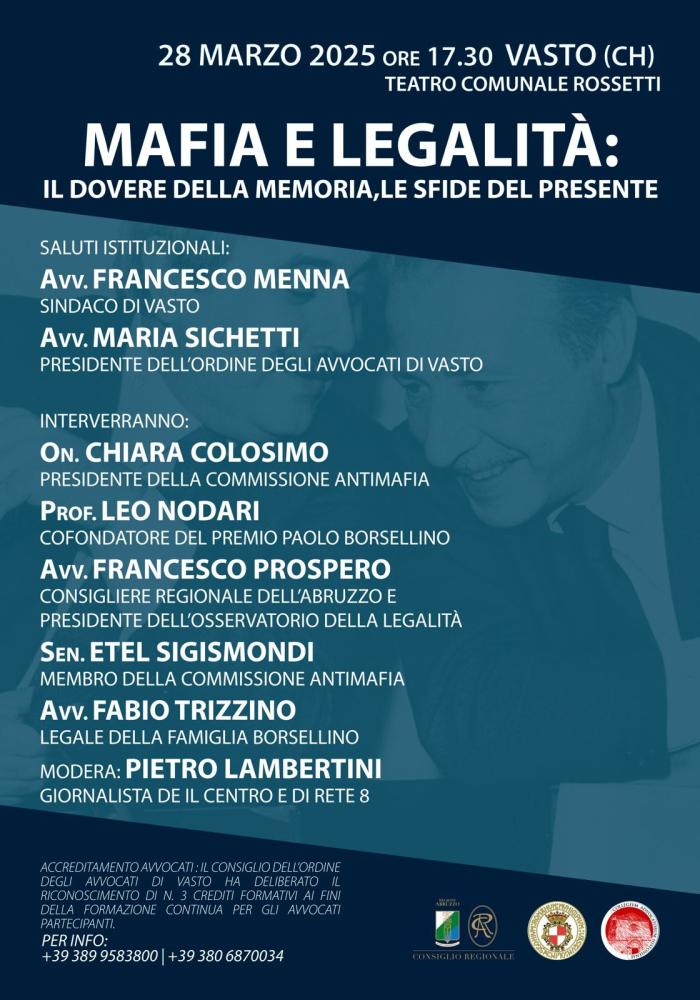 Legalità e memoria è il tema al centro dell’incontro che si terrà venerdì 28 marzo a Vasto. Appuntamento alle 17.30 presso il Teatro Comunale Rossetti organizzato dall’Osservatorio Regionale sulla Legalità e patrocinato dal Comune di Vasto.