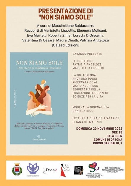 Domani 20 novembre alle ore 18 ci sarà la presentazione ad Ortona di “Non siamo sole. Otto storie di solidarietà femminile”. L’appuntamento è presso la Sala Eden, corso Garibaldi 1, alle ore 18. Animeranno l’incontro le scrittrici Patrizia Angelozzi e Maristella Lippolis e la Dott.ssa Andreina Poggi, segretaria della Fondazione Abruzzese Scienze per la Vita, moderate dalla giornalista Daniela Ricci. Le letture di brani del libro saranno curate dall’attrice Eliana De Marinis.