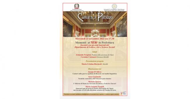 Si terrà mercoledì 23 novembre, dalle ore 17.30 nel Salone storico della Prefettura di Chieti, il terzo appuntamento del progetto “Momenti atTesi in Prefettura. Incontri con giovani laureati del Dipartimento di Lettere, arti e scienze sociali”.