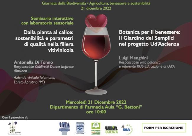 Mercoledì 21 dicembre, alle ore 10, presso l’Aula “G. Bettoni” del Dipartimento di Farmacia del Campus di Chieti, interverrà la responsabile regionale di “Coldiretti Donne Impresa Abruzzo”, dott.ssa Antonella Di Tonno, che terrà un seminario interattivo dal titolo "Dalla pianta al calice: sostenibilità e qualità nella filiera vitivinicola”.